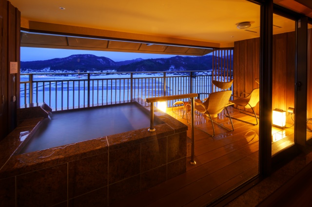 晴れの日には最上階の展望露天風呂から佐渡島まで見渡すことができます