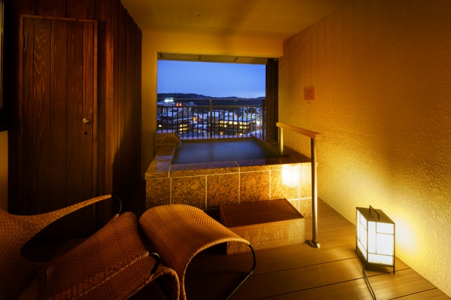 展望露天風呂が付いたダブルサイズツインルームと7.5畳和室、リビングを完備した和洋室